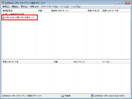VPN クライアント接続マネージャには、上図のように「VPN Gate 公開 VPN 中継サーバー」というアイコンが登録されています。このアイコンをダブルクリックしてください。