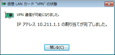 VPN 接続中は、Windows 上に仮想的な LAN カードが作成され、その仮想 LAN カードに「10.211.」で始まるプライベート IP アドレスが割当てられます。また、デフォルトゲートウェイが仮想 LAN カードに設定されます。このことを確認するためには、Windows のコマンドプロンプトから「ipconfig /all」コマンドを実行してみてください。